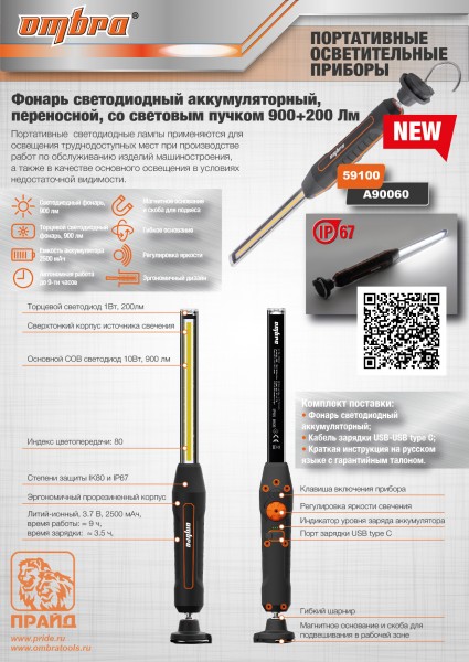 Ombra A90060 Фонарь светодиодный аккумуляторный, переносной, с световым пучком 900+200 Лм A90060