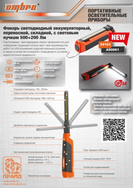 Ombra A90061 Фонарь светодиодный аккумуляторный, переносной, складной, с световым пучком 500+200 Лм A90061