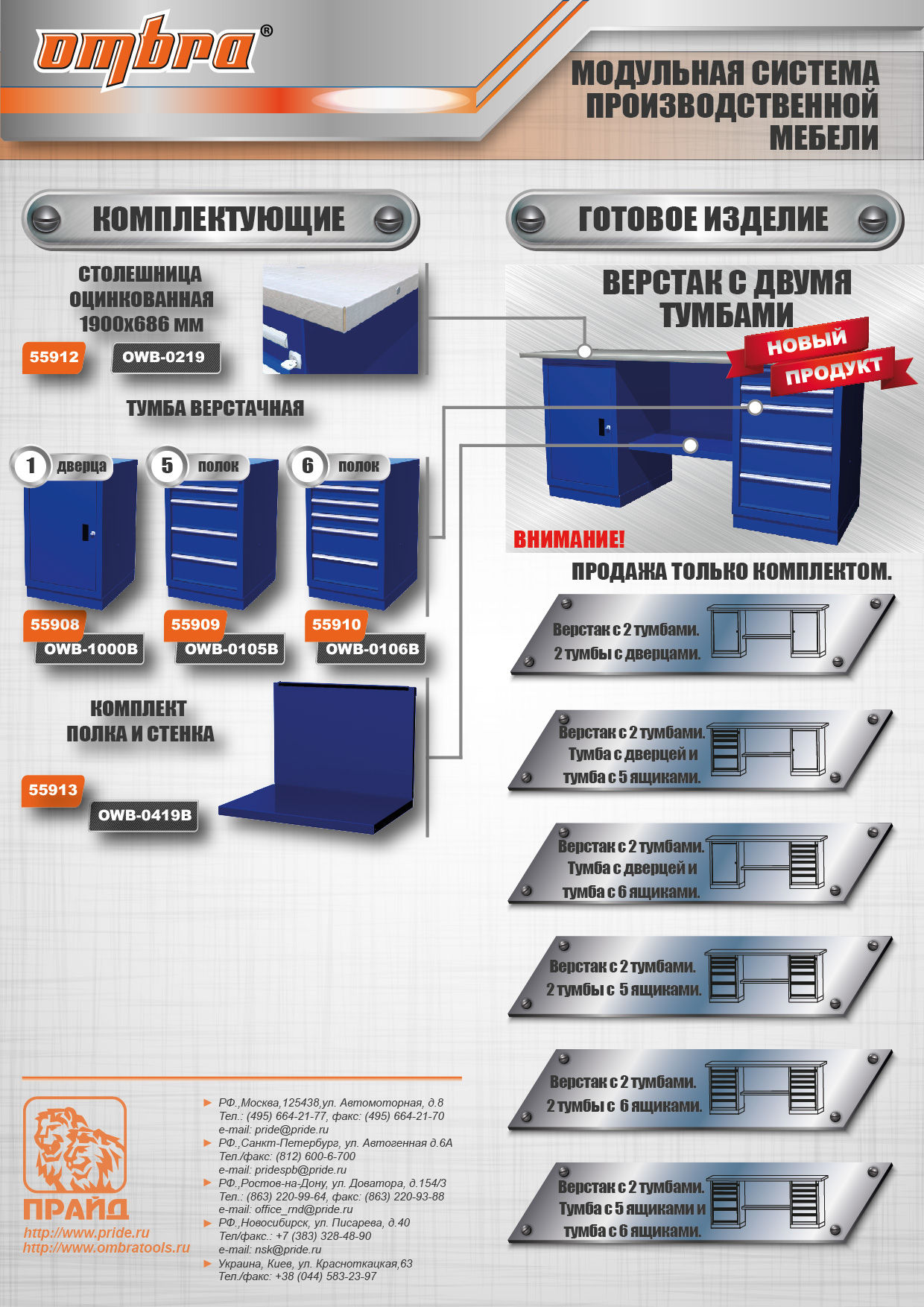 Верстаки с одной и двумя тумбами серии "OWB" OMBRA предназначены для оборудования стационарных рабочих местах в мастерских, цехах и других помещениях. Верстак оснащен специальными тумбами для хранения инструментов, оснастки, запасных частей, а также рабочим столом для обработки вручную изделий из металла, дерева и других материалов. Также, на рабочую поверхность стола верстака допускается установка тисков и других вспомогательных приспособлений. Верстаки cерии "OWB" OMBRA отвечают самым высоким требованиям потребителей в любой сфере деятельности. Современный внешний вид, строгость линий и размеров, удобство и комфорт в использовании, отсутствие ощущения "громоздкости" при высокой прочности изделий создают уют, повышают производительность труда.