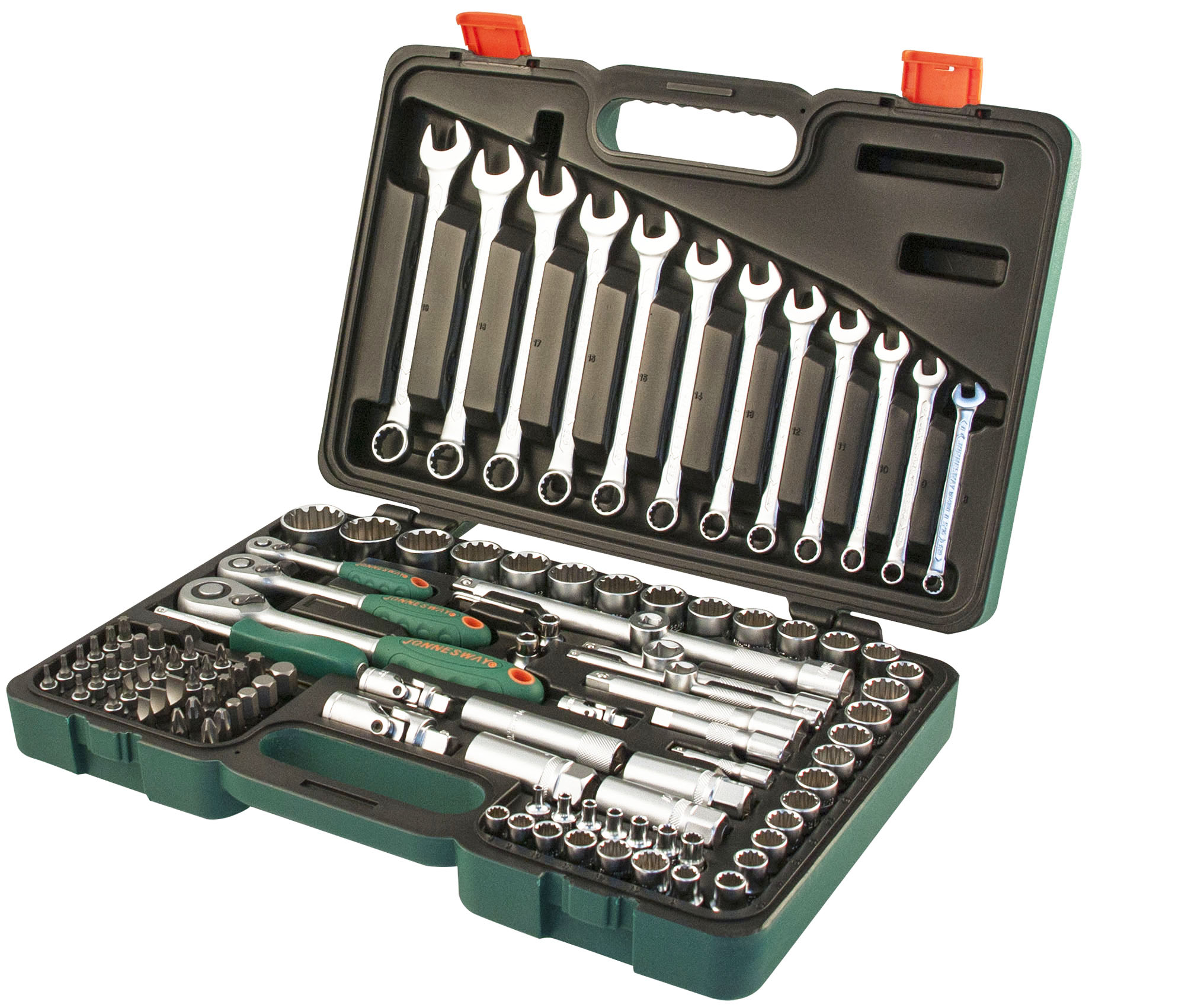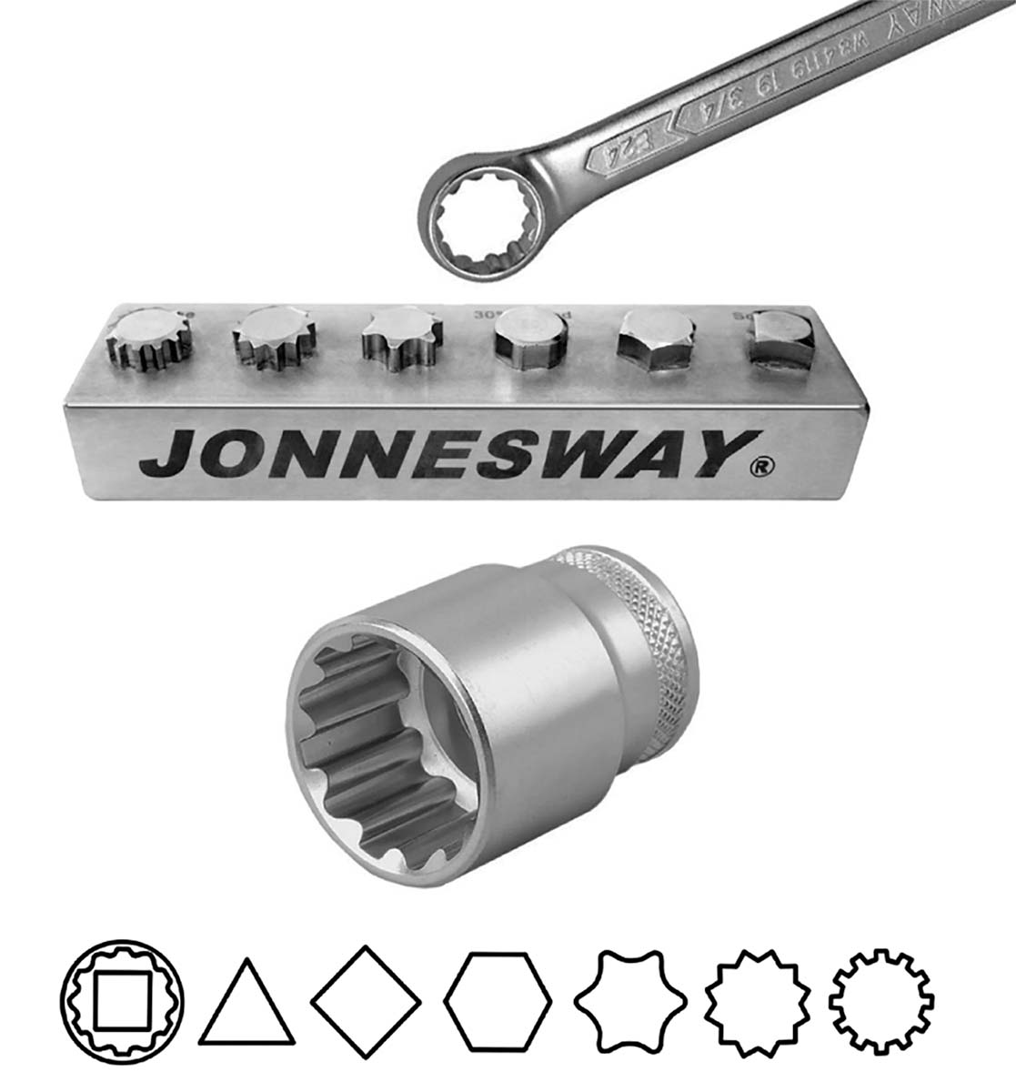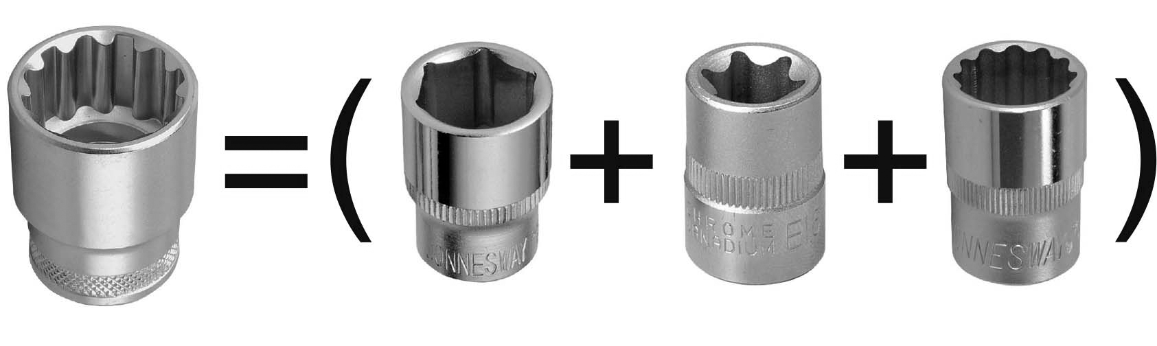 Опытные мастера знают, как непросто в ограниченном рабочем пространстве разместить все многообразие требуемых инструментов, чтобы было удобно работать. Мы рекомендуем и будущим специалистам, связанным с ремонтом и обслуживанием авиационной, сельскохозяйственной, специальной и тяжелой техники, с кузовным ремонтом, обратить внимание на данный набор. Один номинальный размер головки или ключа JONNESWAY® «SUPER TECH» подходит для семи (!) различных профилей и применяется для гаек и головок болтов 6-и и 12-гранных метрических размеров, 6-и и 12-гранных дюймовых размеров, болтов внешний TORX®, SPLINE®, головок крепежа четырех- и трехгранных. Система «SUPER TECH» способна справится с поврежденным (скругленным до 50%) крепежом. Пятно контакта с крепежом в данном случае распределено по большей площади в отличие от стандартного профиля, имеющего точечные пятна контакта.