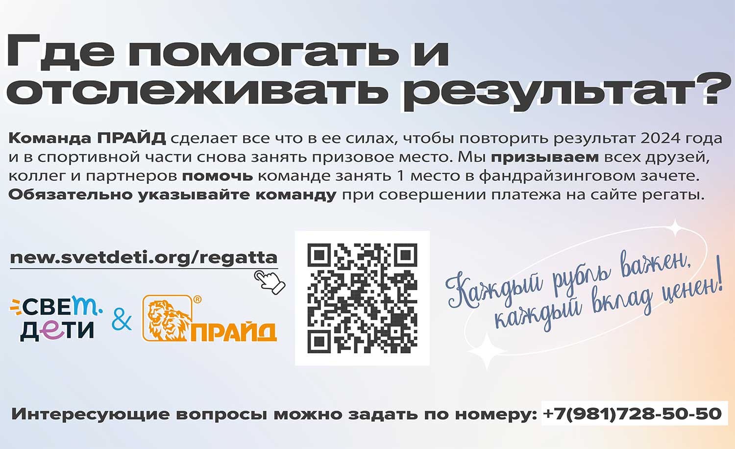 Регата — это не только спортивное соревнование, но и возможность проявить корпоративное единство и поддержать важную инициативу. Победитель определяется по итогам гонки и по сумме собранных пожертвований. Мы приглашаем наших сотрудников, клиентов и партнёров поддержать команду ПРАЙД — вместе мы можем больше!
