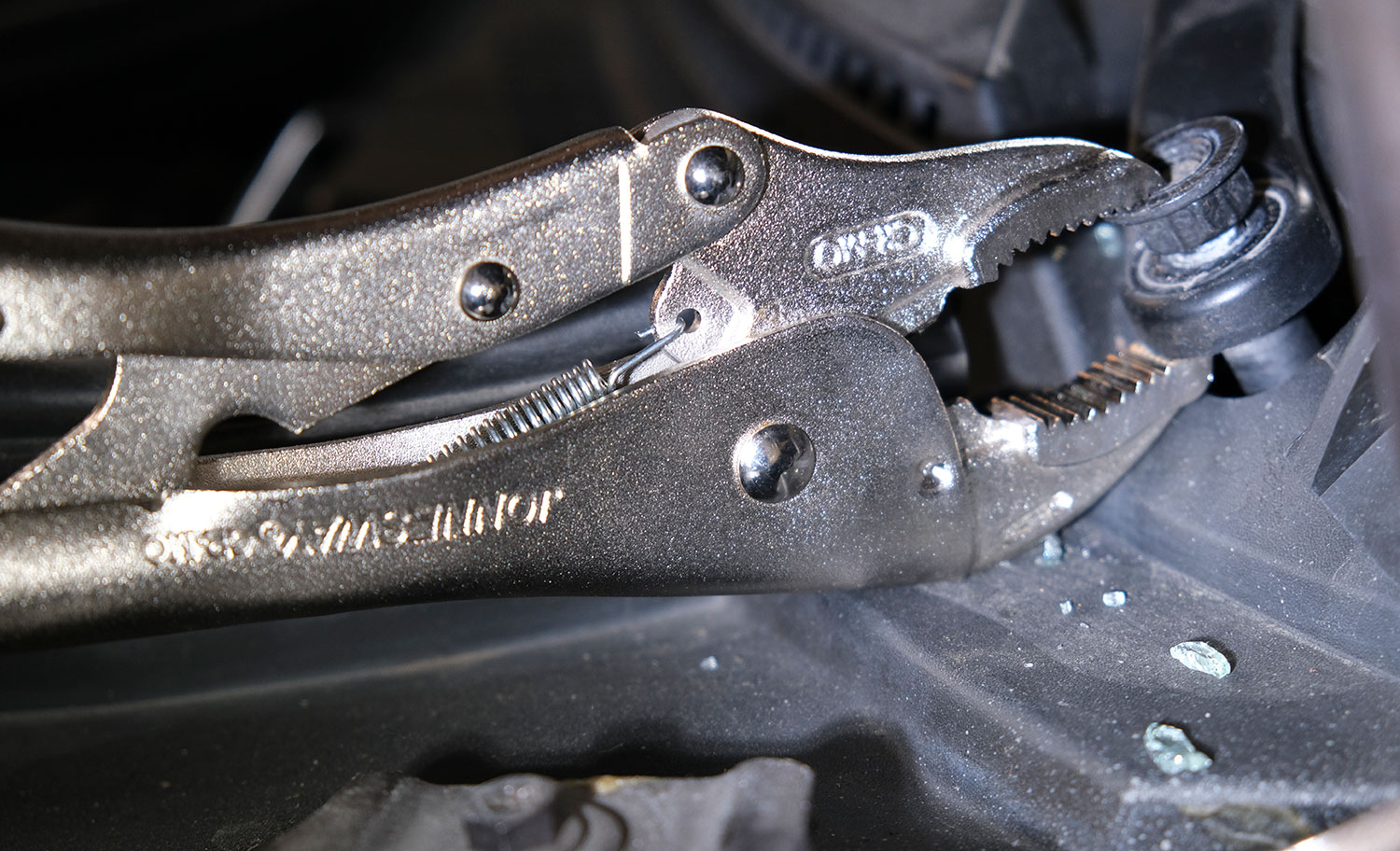 Ну и третий момент, который также заслуживает отдельного внимания - использование зажимных клещей в качестве съемника поводков стеклоочистителя. Как это работает? Очень просто: сначала мы откручиваем гайку рычага дворника, затем переворачиваем её обратной стороной и накручиваем её обратно на шток трапеции, но не до конца, оставляя 3-4 миллиметра зазора. Затем берём наши ручные тиски и делаем упор с одной стороны на внутреннюю часть поводка, а с другой - на гайку сверху, после чего сжимаем тиски руками с усилием, тем самым как бы создавая напряжение.