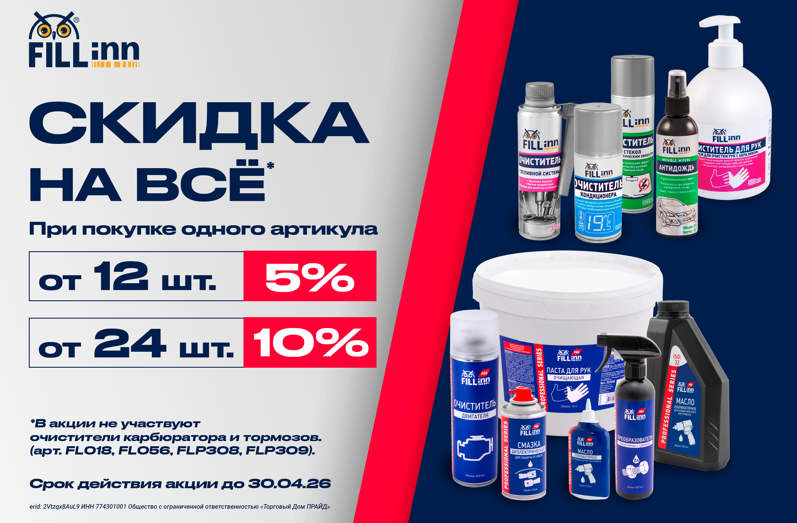 С 25 марта и до конца апреля действует специальное предложение на продукцию FILL Inn, включая линейку FL PRO. В этот период при закупке определённого объёма товаров клиенты смогут получить дополнительную скидку.