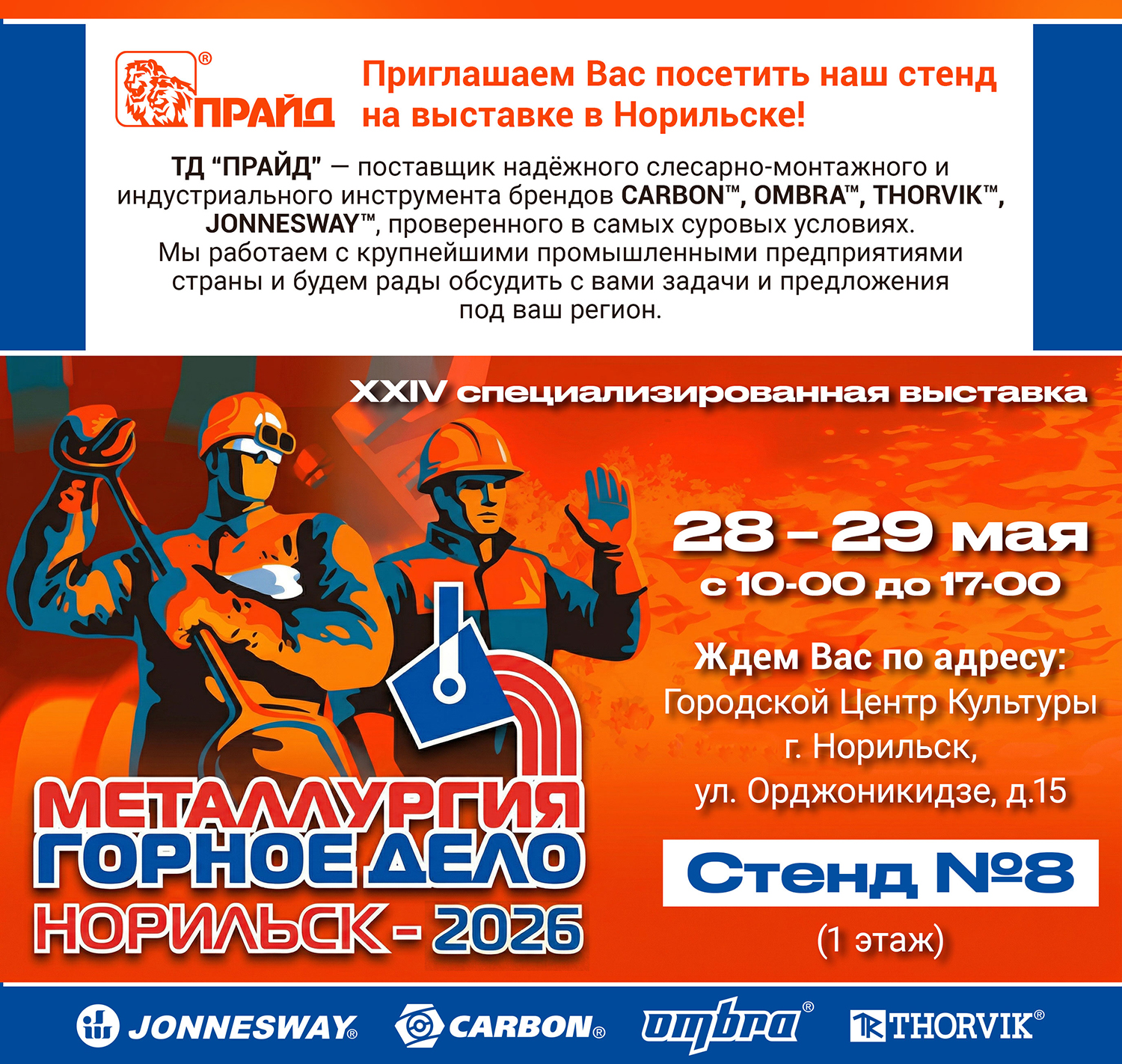 ПРАЙД приглашает партнеров, специалистов и всех заинтересованных посетить наш стенд на отраслевой выставке "Металлургия. Горное дело. 2026", которая пройдет в Норильске 28-29 мая 2026 года.