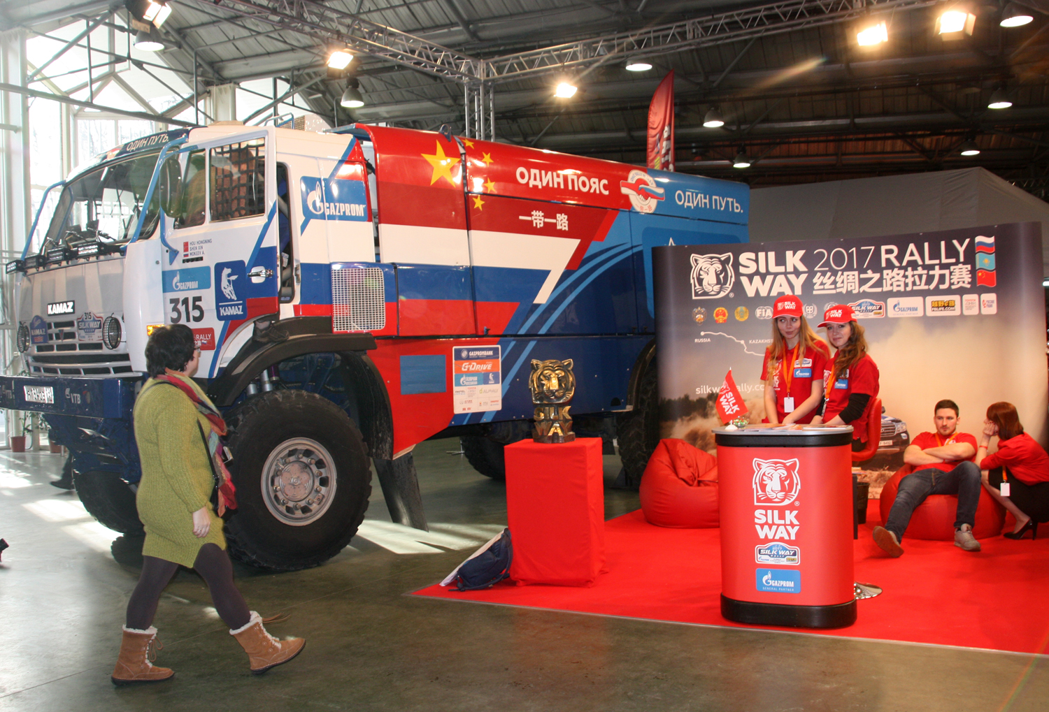 Самым же ярким экспонатом стал боевой грузовик команды «КАМАЗ-мастер». Он вместе с трофеем ралли-марафона «Шёлковый путь» возглавлял стенд ралли.