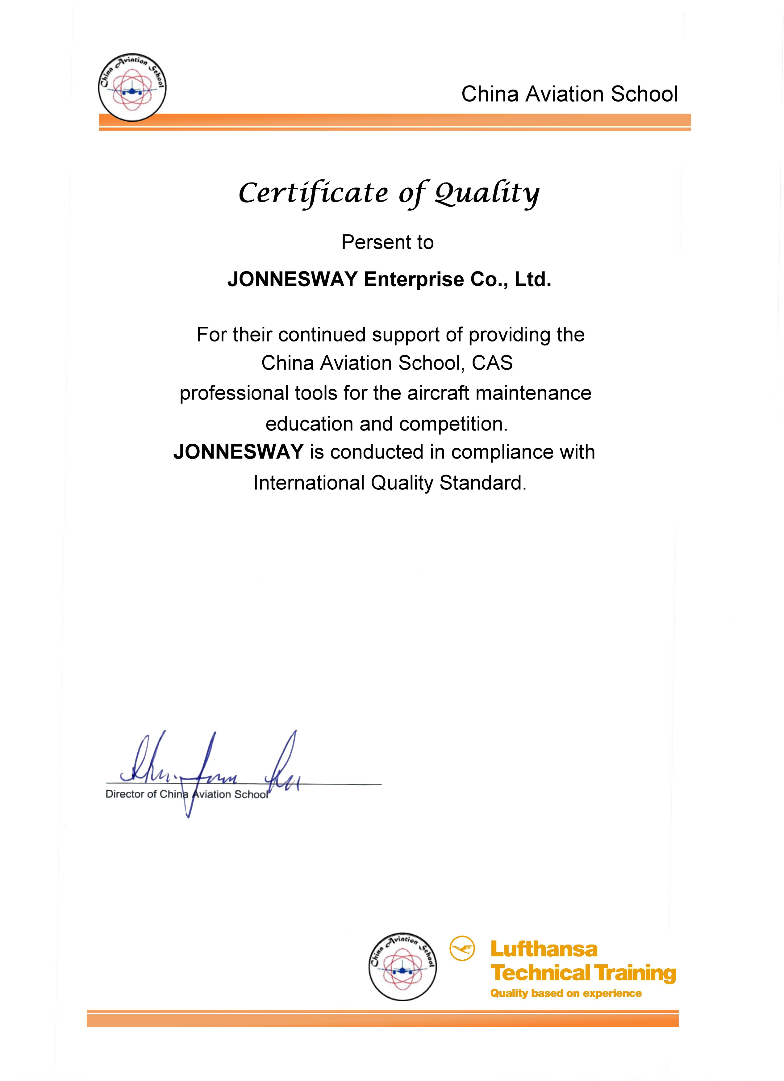 Профессиональные инструменты Jonnesway был выбраны в качестве стандартных инструментов для программы обучения по ремонту и обслуживанию самолетов в CAS, официальном учебном центре авиакомпании Lufthansa в Азии, а также для Национальных Аэромеханических Профессиональных Соревнований. Это большая честь и награда за нашу непрерывную работу и упорство в достижении безупречного качества продукции.